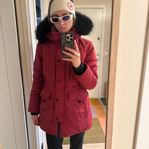 Superdry vinterjakke i størrelse M for kvinner. Jakken er rød og har en polstret design med hette og pelskant. Egnet for kaldt vær og utendørs bruk.