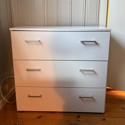 Helt grei kommode, mangler en knopp og har litt skrammer her og der. Må hentes i Åsgårdstrand