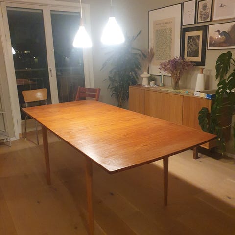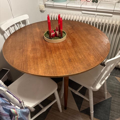 Kjøkkenbord i heltre med klaff selges. Bordet har hvite ben med teak bordplate. Uten klaffen opp er bordet 75cm lang og 74 cm bred. Med klaffen oppe er bordet 114 cm lang.