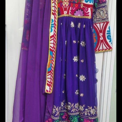 Magedans kjole, lilla med paljetter. Den er i størrelse S/M. Kjøpt ny for kr 2000