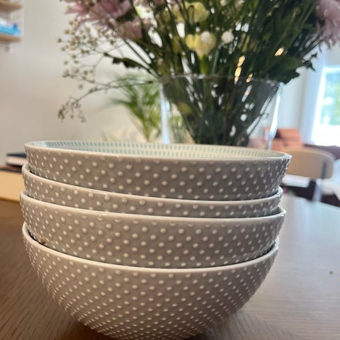 Skåler laget i porselen med et rillet mønster på utsiden. Skålene kommer i forskjellige farger, inkludert hvit, blå og grønn. Sender ikke så må hentes i Skien.
