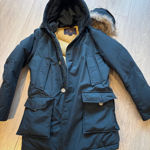 Pent brukt Arctic Parka i navy fra Woolrich i størrelse S med avtagbar pels. Litt av pelsen har gått av (se bilde) men dette er litt synlig når jakken er på. Ellers er jakken i veldig bra tilstand.
