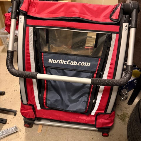 Nordic Cab med mye utstyr. Kan brukes som sykkelvogn med tilhørende feste. Joggevogn med stort hjul foran. Pulk både med hjul eller med ski. Følger med ekstra sidepaneler og et komplett uåpnet nytt sett trekk. Har også cargo trekk når man ikke trenger full vogn. Denne er brukt som lastevogn og har derfor ikke seter, dette kan kjøpes separat. Trekksele kan også kjøpes separat.