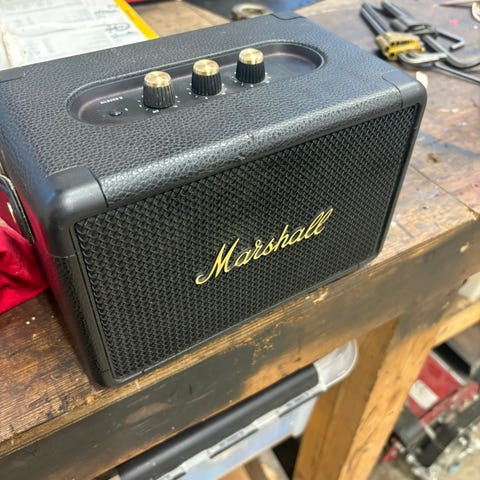 Marshall høyttaler med klassisk design og kontrollknapper på toppen. En bærbar enhet som kan brukes til avspilling av musikk i hjemmet eller andre steder. Har tilkoblingsmuligheter bak for enkel bruk. Varen må hentes😊