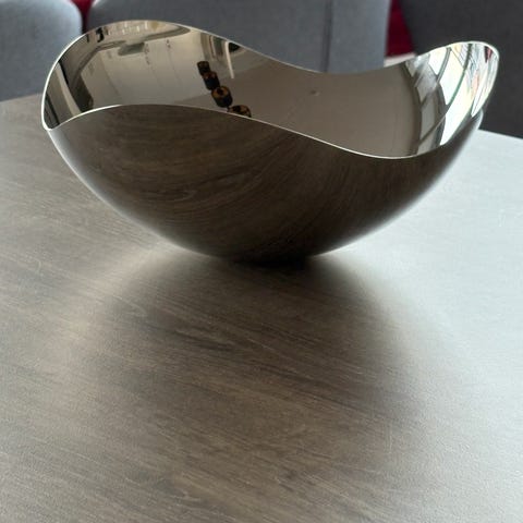 Bloom-skål fra Georg Jensen selges. Skålen er noe avlang: 22 cm lang og 14 cm bred, med asymmetrisk bølge. Les mer her: https://www.illumsbolighus.no/interi%C3%B8r/dekorasjon/sk%C3%A5ler%2C-brett-%26-fat/sk%C3%A5ler/bloom-medium-sk%C3%A5l%2C-h%C3%B8y-900547075.html