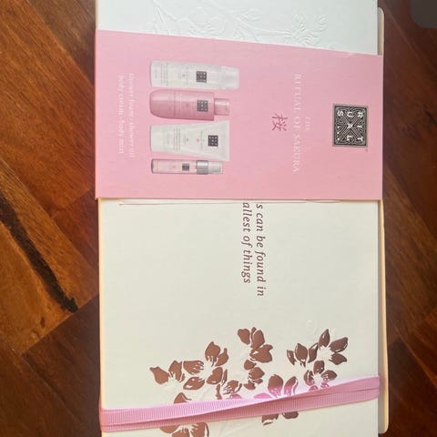 Rituals The Ritual of Sakura gavesett som inneholder flere hudpleieprodukter. Settet inkluderer en body scrub, dusjskum, body cream og en liten duftflaske. Produktene har en floral og frisk duft inspirert av kirsebærblomstring og passer til daglig bruk.