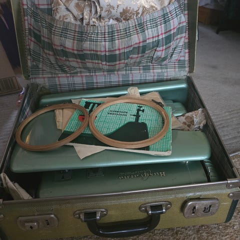 Rosemåla strikkepinne -oppbevaring for den strikkefrelste eller for noen som liker vintage rosemåla treprodukter. Malt på 60-70 tallet basert på andre gjenstander i samlinga.