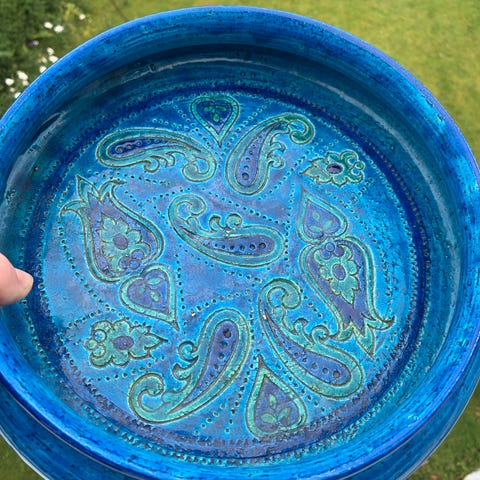 Kjent samlerserie! Keramikkbladet er formet som et blad. Produsert i England ca 1950-60tallet. Dyp rød/brun glasur med grønn irisering og gullkant. (Med originalt veggoppheng fra fabrikk). Lengde: 34 cm og bredde: ca 12 cm