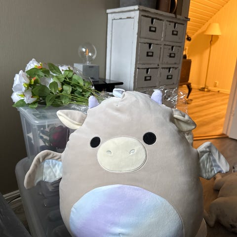 Squishmallows selges. 19 cm. Kun stått til pynt, så fremstår som ny. Har ikke blitt lekt med. Sømmen opp ved «håret», er litt ujevn, som gjør at det er en liten ujevnhet i stoffet. Dette vises på bildet.