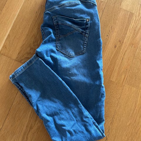 Klassiske jeans fra Fransa denim med rette ben. Disse blir spesielt stilige om de brettes opp til ankelen. Str 38. Livvidde 80 cm, livhøyde 24 cm indre beinlengde 80 cm. Pent brukt uten synlig slitasje.