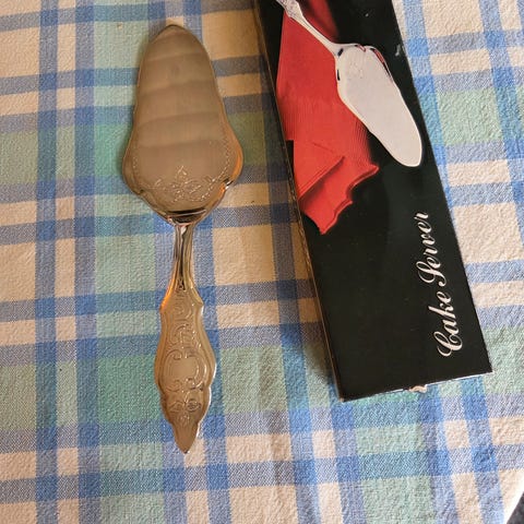1 stk kakespade flat rose i nysølv selges. L: 24,5 cm. Må hentes, sender ikke.