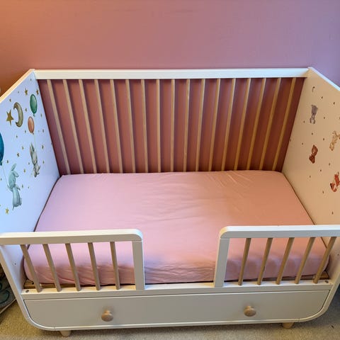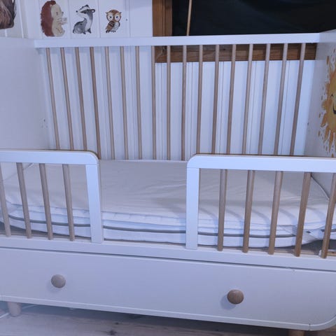 IKEA Sprinkelseng barneseng med hvit ramme og naturlige tredetaljer. Barnesengen har en praktisk skuff under for oppbevaring. Kan bygges om til småbarnsseng. Pent brukt til ett barn. Selges ny for 4495,-