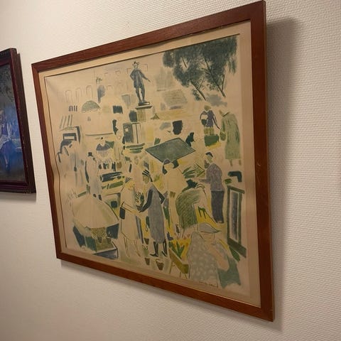 Tresnitt av Knut Frøysaa uten tittel.Landskap .Signert og datert 1977 i høyre hjørne.Nummerert 42/85. Mål:40x44 Mål inkludert passepatot og ramme:50x55. Noen små skader på rammen