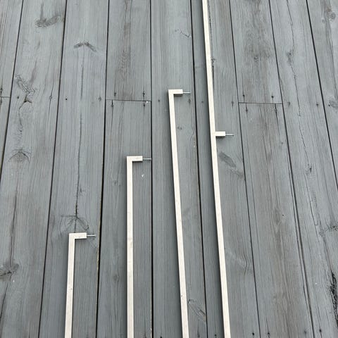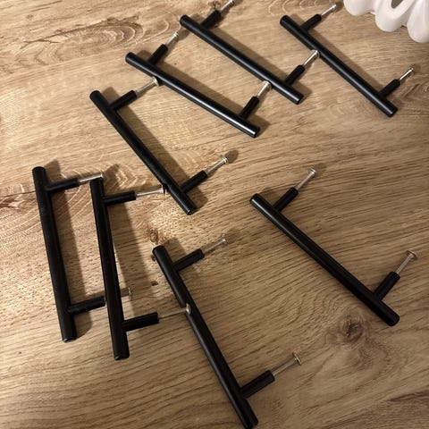 Håndtak i stål, cc 128 mm. 19 stk med skruer. Håndtakene har sittet på kjøkken fronter som er 16mm, de passer til 19mm fronter også.