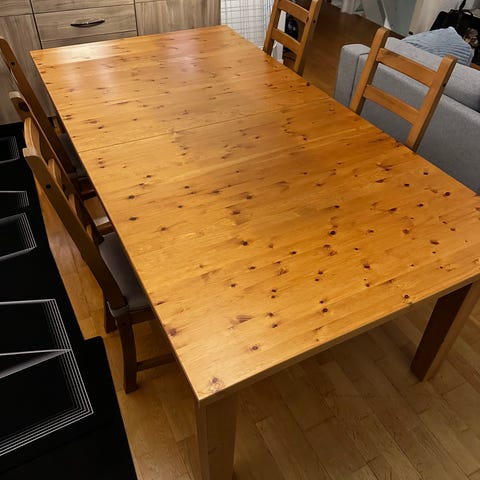 Solid og godt spisebord i bjørk. Et godt og stødig familiebord, med praktisk ileggsplate. Plass til minst 8-12 personer. Bordplaten er pusset og det opprinnelige lakklag er fjernet. Det har blitt såpebehandlet og er nå lys bjørkefarge.