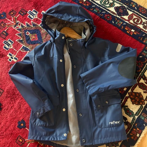 Foret regnjakke fra Reflex i str 122. Jakken er mye brukt, men har ingen skader eller mangler. Kan være noe skjoldete i fargen.