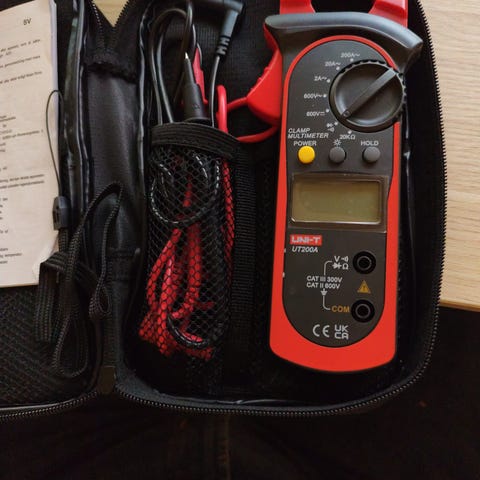 Caltek AG 1100 analog multimeter med måleområde for spenning, strøm og motstand. Enheten har en roterende bryter for valg av måleområde og medfølgende testledninger. Passer for generell elektrisk måling.