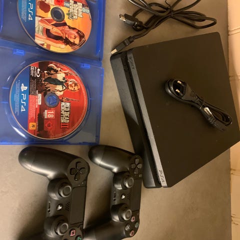 Sony Playstation 4 hvit konsoll med en hvit kontroller. Inkluderer tre spill: Horizon Zero Dawn, Ratchet & Clank, og Red Dead Redemption II. Konsollen har standard tilkoblinger og er beregnet for spill på Playstation 4-plattformen.Hvis du vil ha den med spill så får du den for 1800kr.Hvis du ska ha bare ps4 så får du den for 1500 kr.