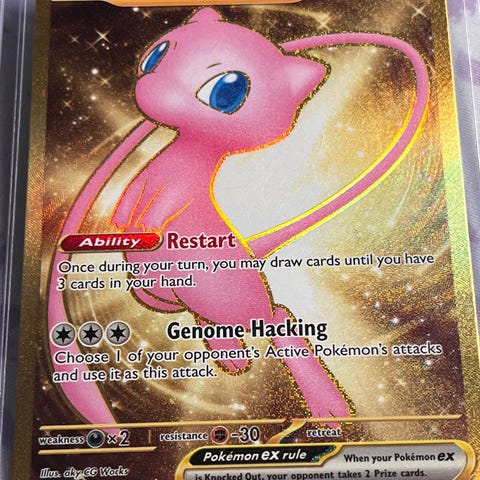 Pokémon Mew EX samlekort med 180 HP og evnen Restart som lar deg trekke kort til du har 6 kort på hånden. Kortet har angrepet Genome-Hacking som gjør skade basert på antall aktive Pokémon i motstanderens benk.