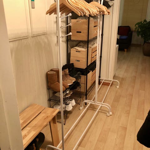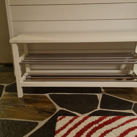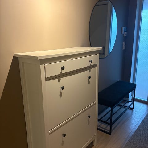 Praktisk kommode til sko med en vanlig skuff øverst. Har noen bruksmerker, men fungerer som den skal og ingen store merker. Hentes på Borre