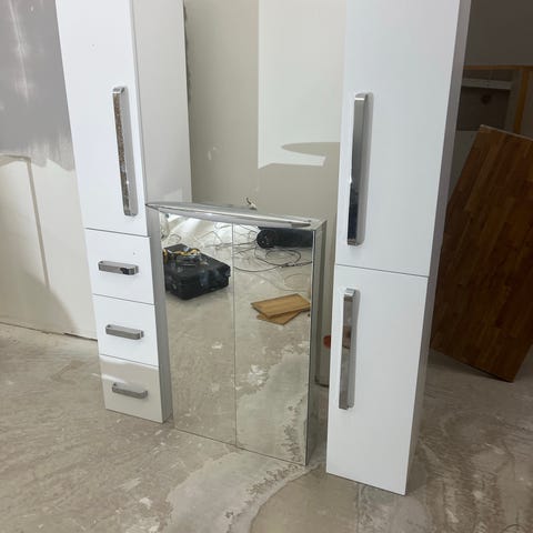 Vi kjøpte disse inn når vi pusset opp badet vårt, men de ble litt for dype og vi måtte finne en annen løsning. Midt oppi oppussingskaoset ble de helt glemt, og skruene mangler, disse mener jeg man får gratis hos megaflis. har fått noen småriper under lagring (se bilde).