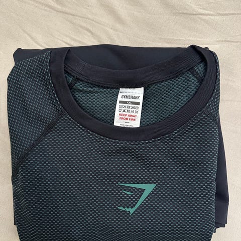 Gymshark Fitness langermet herretrøye i størrelse M, svart farge. Designet for treningsbruk med funksjonelle materialer som gir komfort under fysisk aktivitet.