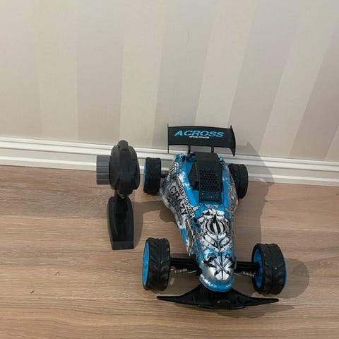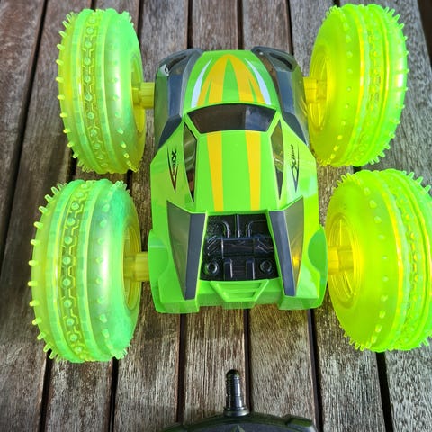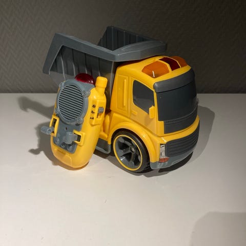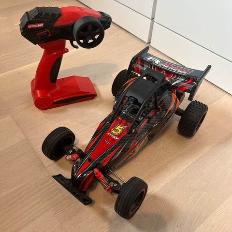 radiostyrt bil med fjernkontroll. Bilen har gule og svarte detaljer og fire hjul med grovt mønster. Egnet for radiostyrt bilentusiaster.