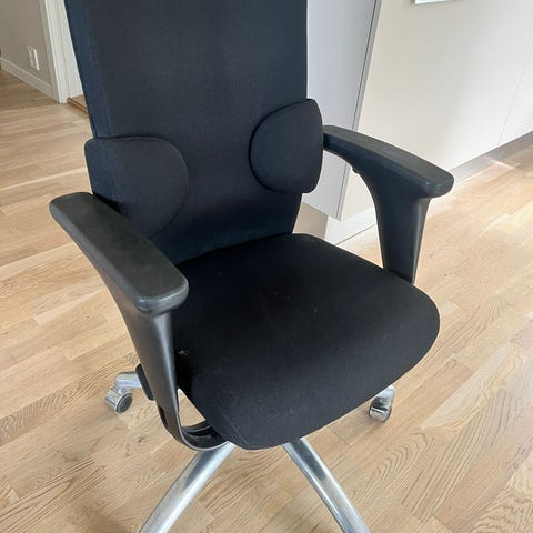 Pent brukt kontorstol fra tyske Interstuhl med sort mesh i ryggen, sort tekstilsete og sorte detaljer.