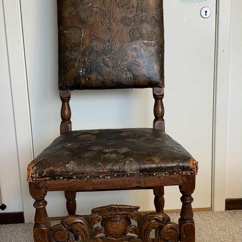 Gammel gyldenlær stol med utskårne ben og ryggstøtte. Stolen har slitt overflate og patina som viser alder og bruk. Egnet som dekorasjon eller samlerobjekt. Selges rimelig . Må hentes innen 6. januar . Gi bud !
