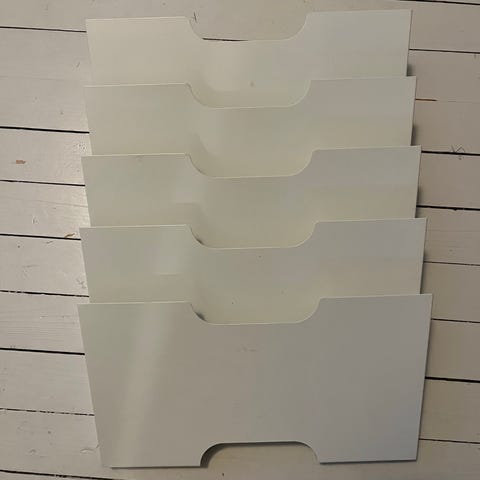 IKEA KVISSLE vegghylle for oppbevaring i hvit farge. Designet for å henges på vegg og organisere dokumenter eller små gjenstander.