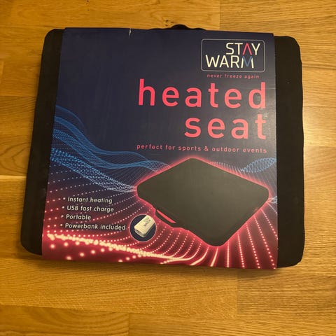 Stay Warm Heated Seat oppvarmet sittepute med isolert oppvarming, USB-lading, og vanntett materiale. Passer for utendørsaktiviteter som sport og arrangementer, gir komfort ved kalde forhold. Mål: 28 x 28 cm, vekt 200 g. Må hentes.