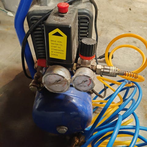 Kompakt luftkompressor av typen Berner Airman 138160, 12V. Ledning med påkoblingsmulighet via 12V-uttaket (sigarettenneren) i bilen. Usikker på om det mangler et munnstykke eller om den kan brukes som den er. Den har ligget en tid ubrukt i boden. Ifølge AI er den ideell for å sjekke og etterfylle dekktrykk på biler, motorsykler og sykler.
