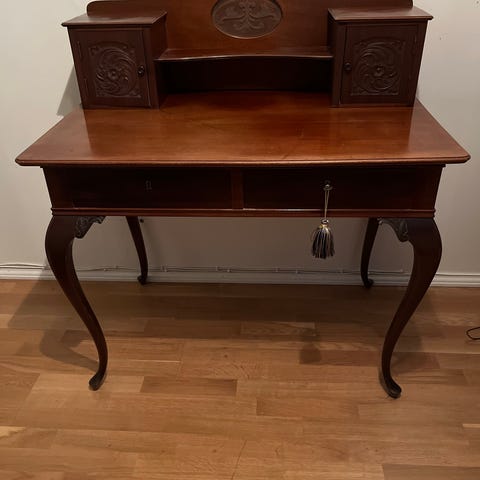 Gammelt skrivebord i eik laget av tre med dekorative, dreide ben og utskårne detaljer. Bordet har en rektangulær bordplate og en solid konstruksjon. H : 75 L :120 B : 99 . Må hentes innen 6. januar . Gi bud ! Stolen følger med