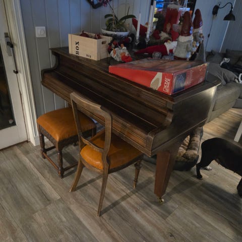Pent piano med bank gis bort mot henting. Pianoet har kub stått til pynt de siste årene. Det er lett tilgjengelig i første etasje. Ingen trapper. Må hentes i drammen sentrum