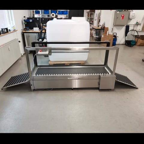 Hjemmelaget manuell tredemølle til hund selges da den ikke lenger er i bruk. Har fungert veldig fint her, brukt av to ulike hunder på ca 10 kg - de har god plass. Materialer til støtteplater på sidene medfølger.