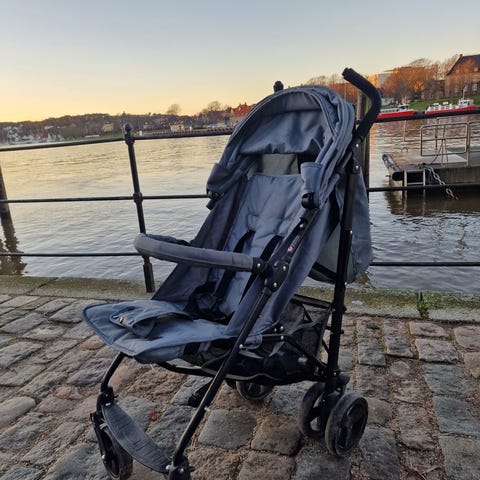 Én kjent feil: låseklips på venstre side av håndtaket er knekt, men vognen kan fortsatt skyves og brukes normalt.