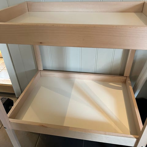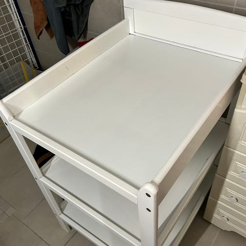Enkelt hvitt stellebord med hyller til praktisk oppbevaring under.