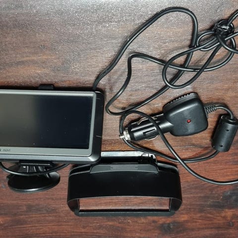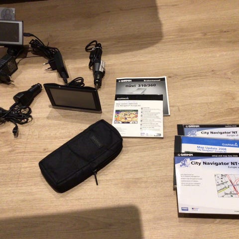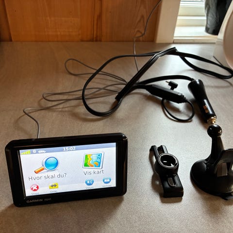 Garmin nüvi 3590 LMT GPS-navigasjonssystem med innebygd kart og trafikkoppdateringer. Enheten leveres med tilbehør som sugekoppfeste, lader, USB-kabel og brukermanual. Passer for bruk i bil for navigasjon og ruteplanlegging.