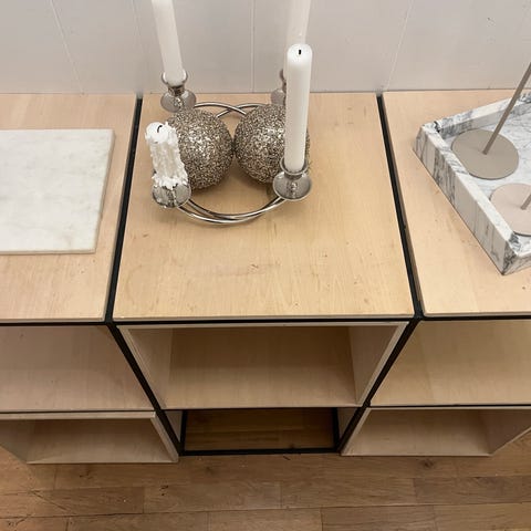 Bokhylle fra Ikea. Består av 4 små skap, og 2 brede skap. Selges for under halv pris. Behjelpelig med bæring, demontering. Den siste av de små, vises ikke på bildet, er bak kassene. Pris kan diskuteres.
