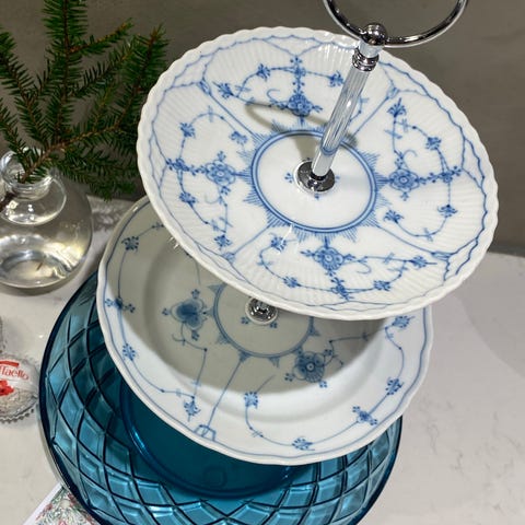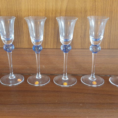 Glass fra glasshytta på Berger v/ Kari Ulleberg. 5stykker blå pynt, 1 stykk gull. 3 stykker lysestaker selges samlet.