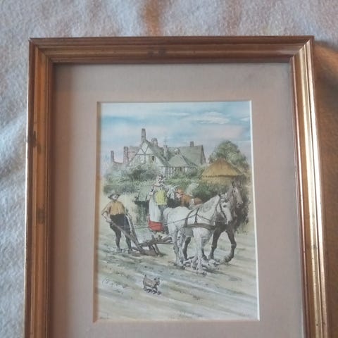 Inrammet kunsttrykk (?)med motivet 'The Meet'. Bildet viser en scene med ryttere til hest samlet utenfor en bygning, med landskap i bakgrunnen. Trykket er plassert i en brun treramme.
