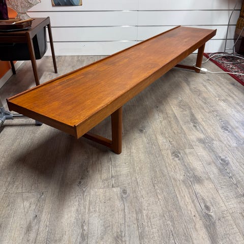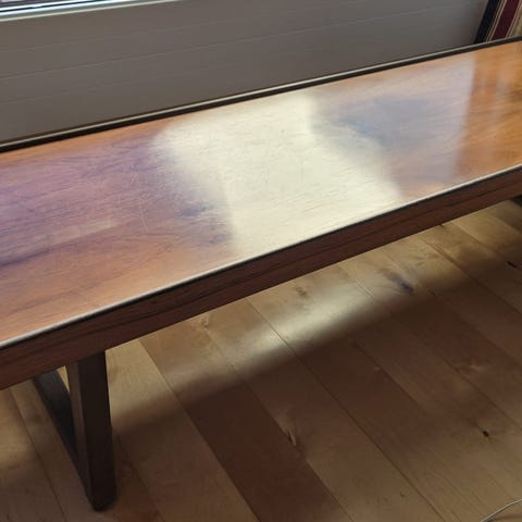 Krobo benk i valnøtt 120 cm x 37 cm dyp, 34 cm høy. Ev. med kasse til blomster til 500 kr ekstra.