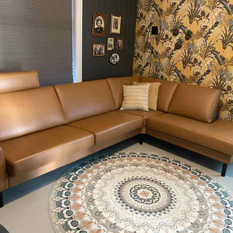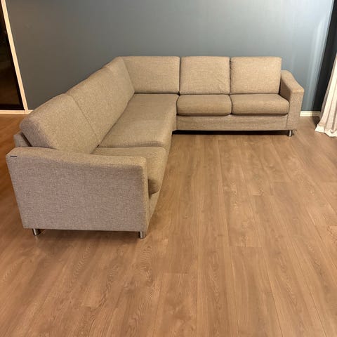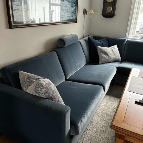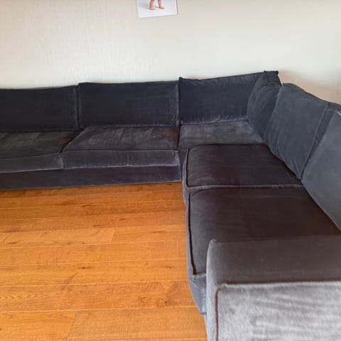 Hjørnesofa i mørk grå velour selges. God og myk å sitte i. Den trenger en runde med vask. Må hentes.