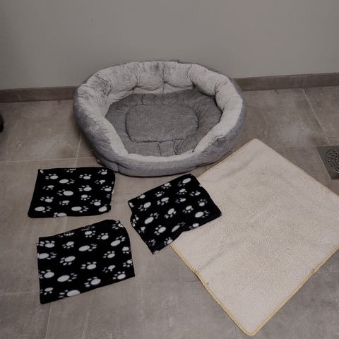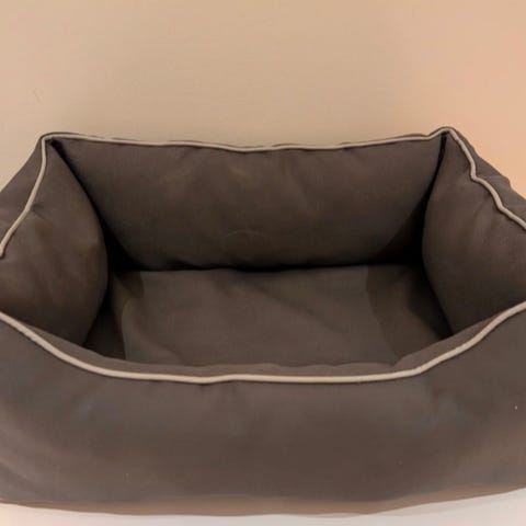 Oval hundeseng i grått mykt materiale. Sengen har polstrede kanter og en pute som kan tas ut. Egnet for små til mellomstore hunder.