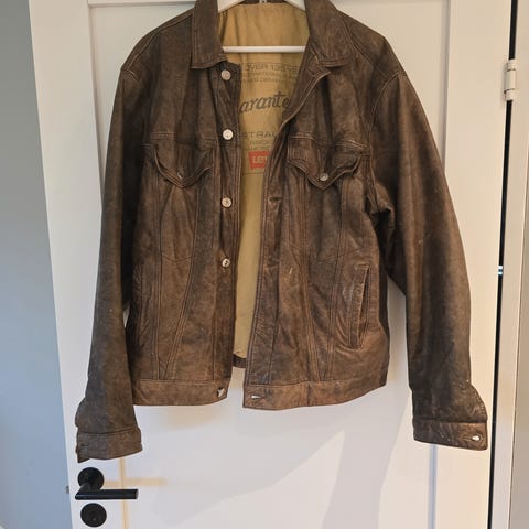 Levi's jakke i skinn, størrelse L, i svart farge. Jakken er kjøpt ny av meg i København engang på 90’ tallet og før 1995. Pent brukt uten synlig slitasje på skinnet, foret er helt og greit. Uansett er dette ikke en ny jakke, men den ekte vare og vintage med kraftig skinn som på en kvalitets MC jakke, ikke som på billige kopier eller nyere jakker. Dette er kvalitet som ikke finner på en nyere jakke. Jeg har ikke anvendt jakka siden jeg jeg bodde på Grunerløkka, bare hengt i skapet siden 1999. Jakken har mange år igjen og fortjener en ny eier som vet hva dette er, fortjener og tåler å bli brukt.