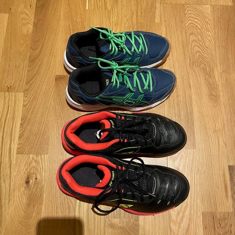Asics Gel-Task 2 herresko i størrelse 40.5 Skoene har en kombinasjon av hvit, blå og gul farge. Designet for innendørs sportsbruk med god demping og støtte. Yttersåle med mønster for grep.
