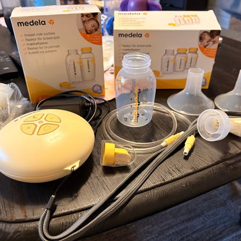 Medela Solo elektrisk brystpumpe med fire gule kontrollknapper. Enheten har en oval form og leveres med tilkoblingsslange og brystskjold i plast. Designet for enkel bruk ved pumping av brystmelk.