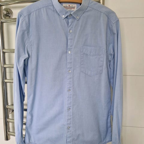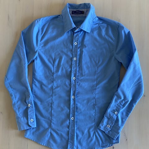 Selger ei lyseblå dress skjorte som har blitt for kort i armene