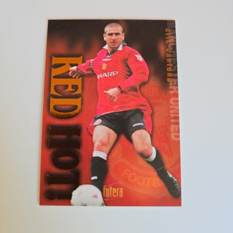 2x Eric Cantona fotballkort fra 1997 med bilder av spilleren og statistikk på baksiden. Kortene viser Cantona i rød drakt og inkluderer informasjon om hans prestasjoner og ferdigheter. 85 per stk