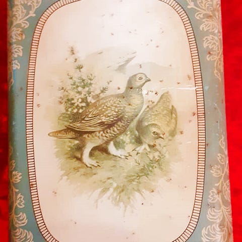 Antikk art deco boks fra ca. 1920. Sommerfugl-motiv og opprinnelig gullfarge som er litt falmet. Trolig opprinnelig vært sjokolade i den.